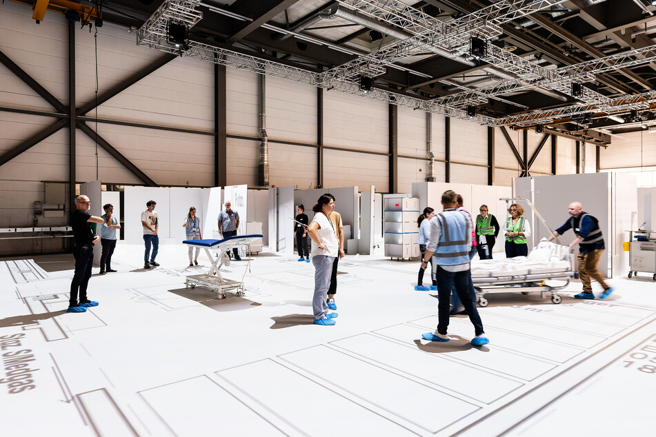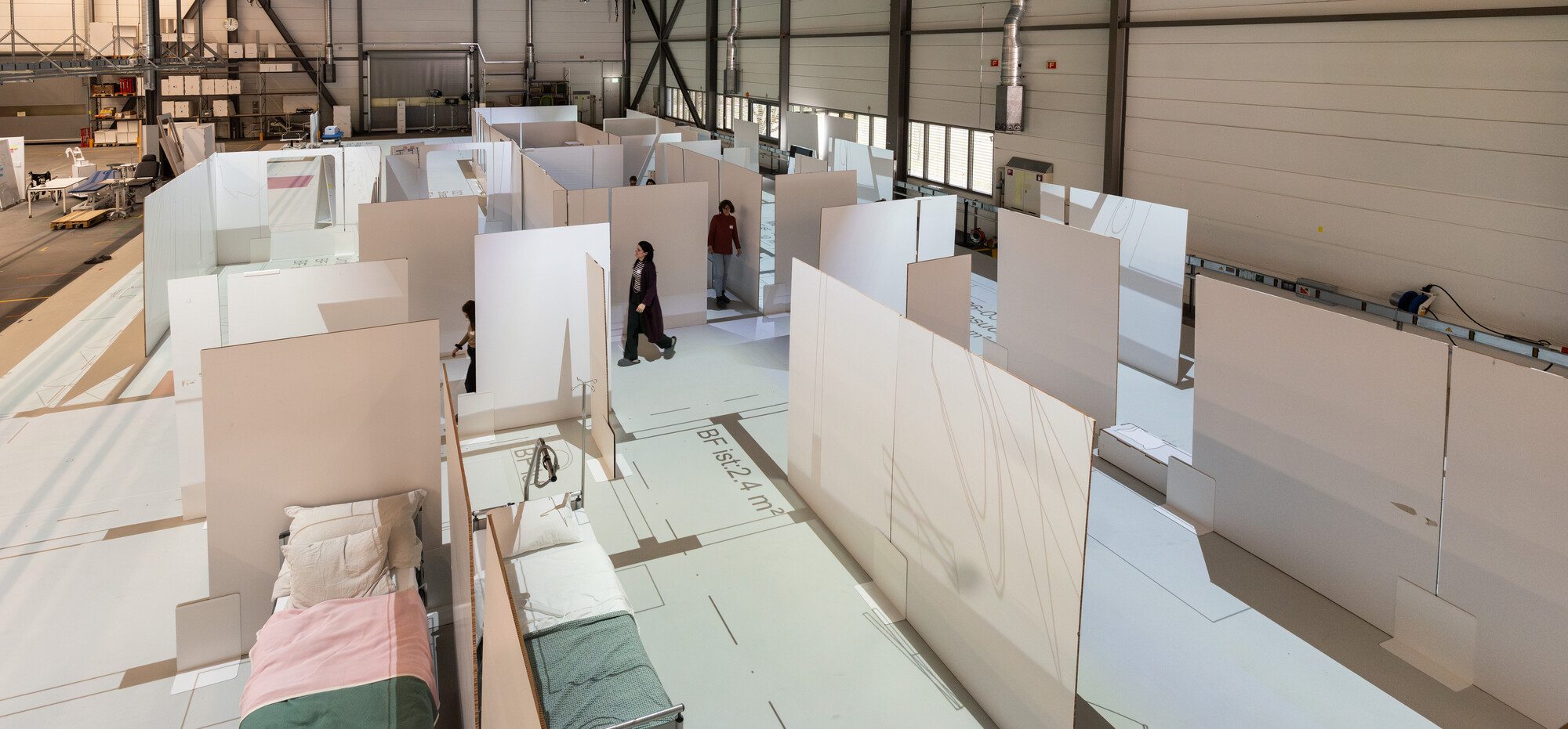 Floor plans covering areas of up to 560 m2 can be projected onto the simulation area in their original size and supplemented with lightweight construction walls, mock-ups and real furnishings appropriate to the planned use. This and the use of augmented reality technology makes it possible for people to experience the planned spaces. This means that planners and future users can jointly test out the planned processes and spaces on a 1:1 scale during the SCDH’s simulation workshops. The engagement of all stakeholder groups in the planning process leads to greater acceptance of the planned spaces. Simulation workshops enable planning errors to be identified and avoided at an early stage in a project. The workshops guarantee greater planning reliability and can contribute to cost savings.